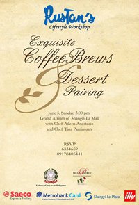 On June 5, 2011 3:00 p.m. until 6:00 p.m., there will be a FREE Exquisite Brews and Dessert Pairing Lifestyle Workshop at the Grand Atrium of the Shangri-la Mall. It is to be led by Chef Aileen Anastacio and Chef Tina Pamintuan. Join and discover the best ways to perk up our taste buds and maximize dessert pairing.